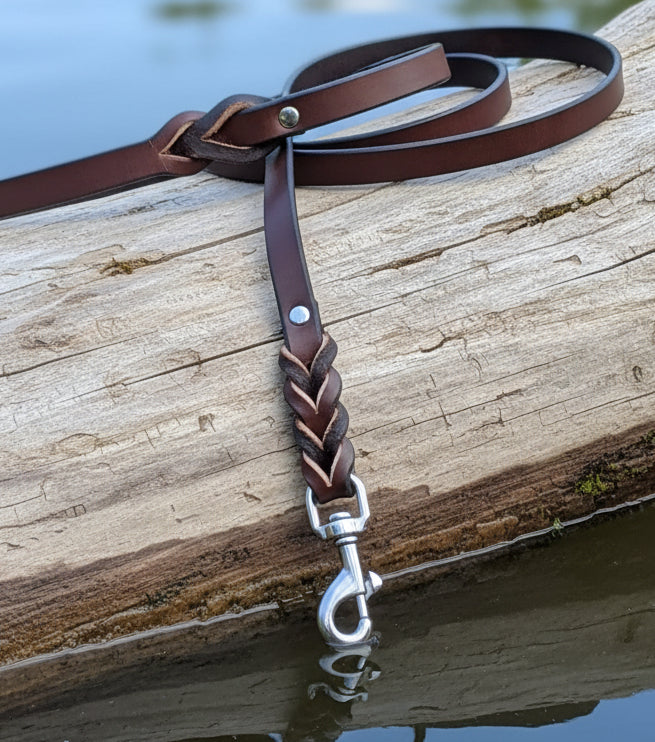 Latigo leash in choclate is stunning , this 6' × 5/8" is finished off with stainless steel snap and solid stainless steel rivets or solid brass. Braided on both ends to polish it off. Soft and flexible feel to it.