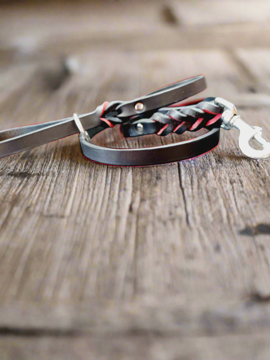 5 foot long × 5/8" wide red/black English bridal by wickett and craig.This beautiful leash does not disappoint, offered to you in all stainless steel hardware,solid stainless steel rivets with ring on handle